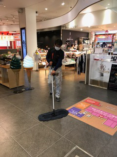 日常清掃で対応しきれない汚れを、定期清掃グループが床面洗浄・ワックス仕上・ガラス清掃等の作業ごとに